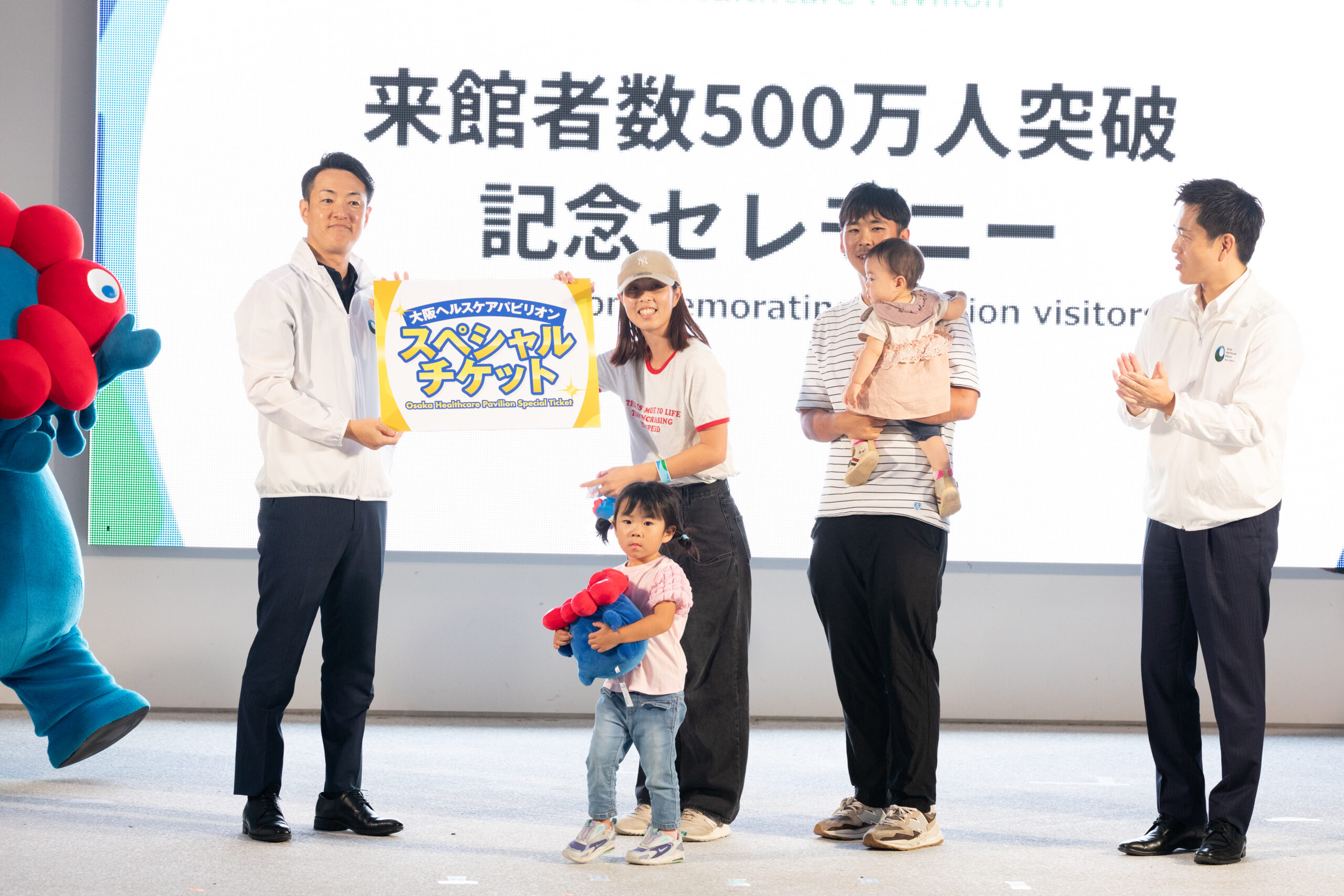 大阪ヘルスケアパビリオンのリボーンステージでは、500万人突破記念セレモニーが行われ、ミャクミャクや大阪ヘルスケアパビリオンのマスコットキャラクターもずやんも登場し、吉村大阪府知事、横山大阪市長、西澤館長より、500万人目の来館者に記念品を贈呈しました。