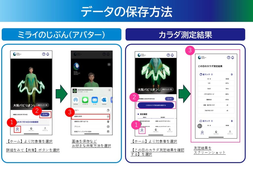 なお、ミライのじぶん(アバター)は画像として保存が可能です。カラダ測定結果は保存機能はございませんので、スクリーンショットなどで必要な画面を撮影して保存ください。